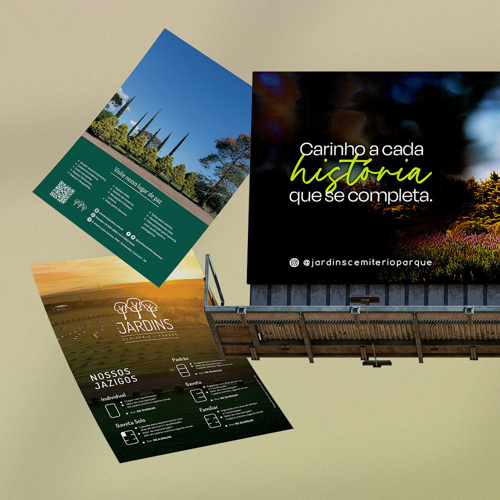 A campanha destaca todos os diferenciais que fazem do empreendimento um dos mais completos e cuidadosos da região: capela ecumênica, serviço de copa, espaço despedida, espaço kids, estacionamento, jardim de inverno, manutenção permanente com jardinagem e paisagismo, recepção acolhedora, salas para repouso, ambientes preparados para velório e monitoramento 24h. Além disso, apresenta as opções de jazigos em padrão parque, inspirados nos cemitérios americanos, totalmente cuidados pela equipe do Jardins.