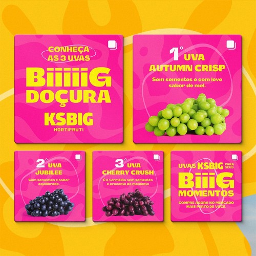 A partir dessa estratégia, os materiais criados para divulgar as uvas foram baseados em conteúdos educativos sobre as diferenças entre cada tipo e seus benefícios à saúde, reforçando que são as melhores em comparação com outras marcas no mercado e incentivando o consumidor a experimentar toda a variedade - tudo envolto em uma paleta de cores rica e vibrante, com diferentes fontes e BIIIG adjetivos.
